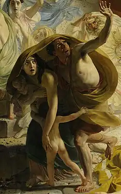 La gente está tratando de escapar de la naturaleza salvaje, en medio de gritos, oraciones y gemidos. La tragedia revela sus sentimientos y la esencia del alma humana en tales circunstancias.[145] Algunos personajes se convierten en personificaciones de generosidad:[146] ante el peligro muestran sentimientos exaltados, devoción, coraje y amor. Entre ellos, dos hijos llevan sobre sus hombros a un padre lisiado, un joven intenta convencer a su anciana y agotada madre de que huya con él. Una madre y sus dos hijas arrodilladas permanecen inmóviles: su fe en Dios es tan fuerte que ponen toda su fuerza en la oración. Junto a ellas, un sacerdote cristiano mira sin miedo lo que está sucediendo frente a él. Una familia intenta superar su miedo huyendo. Un joven novio, olvidando el peligro, mira la cara muerta de la novia aun con la corona de flores de la ceremonia nupcial. El personaje en el centro de la pintura es una mujer que ha caído y yace inconsciente mortalmente herida mientras su pequeño hijo continúa a su lado. Muchos grupos de personajes están en los escalones de la tumba de Escauro y se puede reconocer al pintor Briulov en medio de ellos, ya que quería representarse a sí mismo en el lienzo. También hay personajes negativos, como ese sacerdote pagano que huye asustado y un ladrón que recoge las joyas caídas.[147]