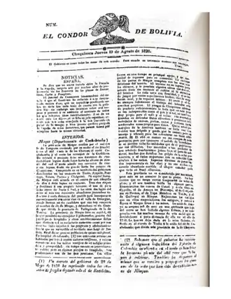 ![]() Portada de El Cóndor de Bolivia del 10 de agosto de 1826. | ||