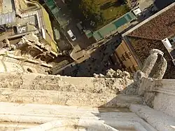 Estos diversos usos, sobre todo por la utilización de fogatas o de productos incendiarios, provocó más de un incendio en la terraza, por lo que se decidió dar otro uso a la terraza y levantar una espadaña de piedra, entre 1660-1736, para sostener las campanas de las horas y los cuartos.[1]
