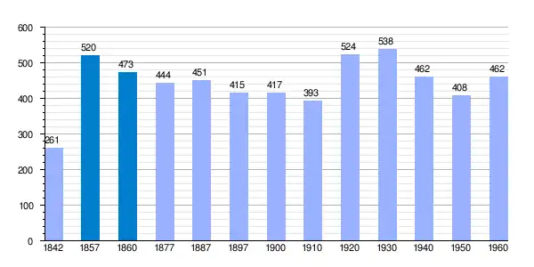| Gráfica de evolución demográfica de Pla de Sant Tirs[2] entre 1842 y 1960 |