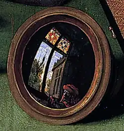Los objetos detallados componen un auténtico bodegón, como se ve en el libro ilustrado, jarrones, oro y joyas, además del espejo que hay en el primer plano. Produce el efecto de ilusión sobre el reflejo de algo que supuestamente queda en las afueras del cuadro. Este detalle, que permite mostrar el virtuosismo del pintor, apareció en otras pinturas flamencas precedentes como El matrimonio Arnolfini, el Díptico de la Virgen con Maarten van Nieuwenhove o Un orfebre en su taller.