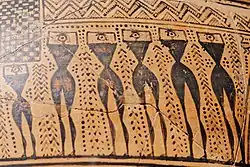 Entre las primeras tallas de piedra del siglo VII a. C. en Creta, la de una diosa en un templo está desnuda,[nota 17] la mano derecha descansando sobre sus pechos, la izquierda sobre su sexo [41][nota 18] siguiendo el modelo de la Astarté siria, que se encuentra en una estatuilla de La Canea del siglo VII a. C. En la estatuilla votiva la diosa indica/oculta su sexo con la mano. Una interpretación de Alain Pasquier [42] de la Afrodita de Cnido —tres siglos después— parece aplicarse aquí: «Afrodita se desnudaría, no solo para mostrar la perfecta belleza de su cuerpo, sino también para dar a su naturaleza de diosa del amor su más intenso poder, por su gesto ella indica con su mano la principal fuente de su soberanía». En cuanto a los héroes de la epopeya, representados esquemáticamente en un Vaso de Eleusis de alrededor de 675-650 a. C., son Odiseo [nota 19][nota 20] (en blanco) y sus compañeros cegando al Cíclope (caras blancas y negras), y están desnudos, quizás porque son figuras de las grandes epopeyas. La estatuilla votiva de un kuros, de 625-600, a. C., lo presenta desnudo de acuerdo a valores similares, como un regalo que agradará al dios. En el plano técnico muestra el interés de modelar a la cera perdida (antes de fundir el bronce, la estatuilla se modela en cera según la técnica del bronce a la cera perdida). Este trabajo de pequeño formato ha permitido renovar la imagen de la figura humana esculpida a escala humana en mármol, «anatómicamente más bella» que las anteriores, en este estilo laberíntico. Prefigura los grandes mármoles de Naxos, Delos y, más tarde, Argos del siglo VI a. C.[43]