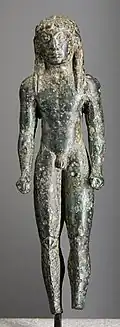 Las estatuillas votivas, en las que aparecen los cuerpos de los personajes de alto rango, están desnudos y aparecen en forma estilizada en estatuillas de bronce, sosteniendo un caballo (un signo de riqueza) o guerreros con armas (otro signo de riqueza). Estos primeros desnudos griegos tallados datan del siglo VII a. C. Su estilización permite una representación que monta los elementos del cuerpo que tienen un nombre, entonces hablamos de un estilo pre-mimético porque no representamos lo que vemos sino lo que sabemos nombrar. Los primeros kouroi, estatuas funerarias o votivas de jóvenes desnudos (representaciones convencionales de un joven típico, para el difunto o como ofrenda, atestiguadas desde finales del siglo pasado),[44] reflejan valores aristocráticos. Su modo de representación se volvió gradualmente más y más mimético: tanto el broncista como el escultor de piedra se esforzaban por representar las formas visibles de sus cuerpos. Pero los kouroi de estilo arcaico (siglo VII-siglo VI a. C.) recuerdan las poses hieráticas egipcias u orientales que estos artesanos conocían, a través de las pequeñas estatuillas que circulaban en la cuenca del Mediterráneo, o por contacto directo con la escultura monumental de Egipto.