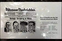 - ↑ Altonaer Blutsonntag (Domingo sangriento de Altona) es el nombre que se le dio a los acontecimientos del 17 de julio de 1932, cuando una marcha de reclutamiento de las SA nazis provocó violentos enfrentamientos entre la policía, las SA y partidarios del Partido Comunista de Alemania (KPD) en Altona. Cuatro comunistas fueron considerados culpables y condenados a muerte. La sentencia se ejecutó con un hacha de mano el 1 de agosto de 1933 en el patio del actual tribunal de distrito de Altona. Estas fueron las primeras ejecuciones “políticamente deseadas” en el Tercer Reich.