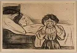 Según un comentario sobre la imagen, Munch creó "figuras expresivas desgarradoras que tocan directamente al espectador. El horror silencioso de la niña ante el rostro de la madre muerta resulta ser una variante del famoso El grito." [2]