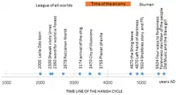 En la cronología interna del universo de Hain, los eventos de esta nouvelle le siguen a Los desposeídos, obra en la cual el ansible y la Liga de los Mundos aún no existen. Sin embargo, esta novela se ubica antes de El mundo de Rocannon, en la cual la comunicación telepática entre terráqueos se ve como una posibilidad distante. Los críticos sugieren que El nombre del mundo es Bosque transcurre en 2368 CE, pero Le Guin no dio ninguna fecha precisa.[24][25]