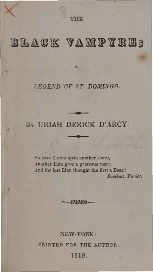 - ↑ D'Arcy, Uriah (1819). The Black Vampyre. p. 13.