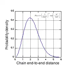 where . La ecuación puede entenderse simplemente como la probabilidad de que una unidad de isopreno NO sea un enlace cruzado (1−px) en N−1 unidades sucesivas a lo largo de una cadena. Dado que P(N) disminuye con N, las cadenas más cortas son más probables que las más largas. Tenga en cuenta que el número de segmentos de la columna vertebral estadísticamente independientes no es el mismo que el número de unidades de isopreno. Para las redes de caucho natural, la longitud de Kuhn contiene alrededor de 2,2 unidades de isopreno, por lo que . Es el producto de las ecuaciones (1) y (3) (la distribución de probabilidad conjunta) que relaciona la longitud de la cadena de la red ( ) y la distancia de extremo a extremo () entre sus nodos de enlace cruzado de terminación: