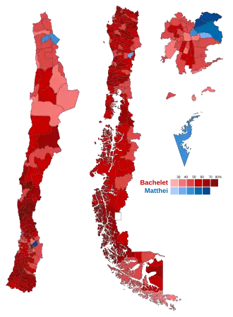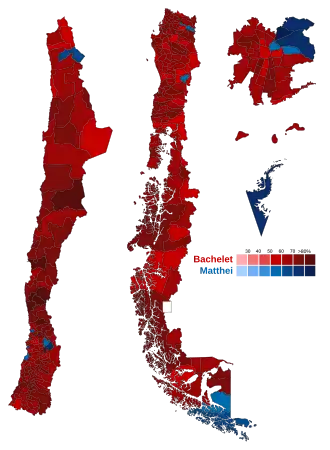 La elección presidencial fue disputada por nueve candidatos,[6]​ una cifra inédita en la historia electoral de Chile.[7]​ En la primera vuelta, Michelle Bachelet de la Nueva Mayoría obtuvo el 46,7 % de los votos válidamente emitidos y se enfrentó en segunda vuelta a la candidata de la Alianza, Evelyn Matthei, quien llegó al 25,03 %.[8]​ En el balotaje entre ambas, Bachelet alcanzó el 62,16 %, mientras Matthei logró el 37,83 %,[9]​ con una participación del 41,98 % de los electores. Además fue la primera vez que los dos candidatos más votados y que deben enfrentarse en balotaje son dos mujeres. Con estos resultados, Bachelet se convirtió en la primera mujer reelecta en la historia de Chile.
