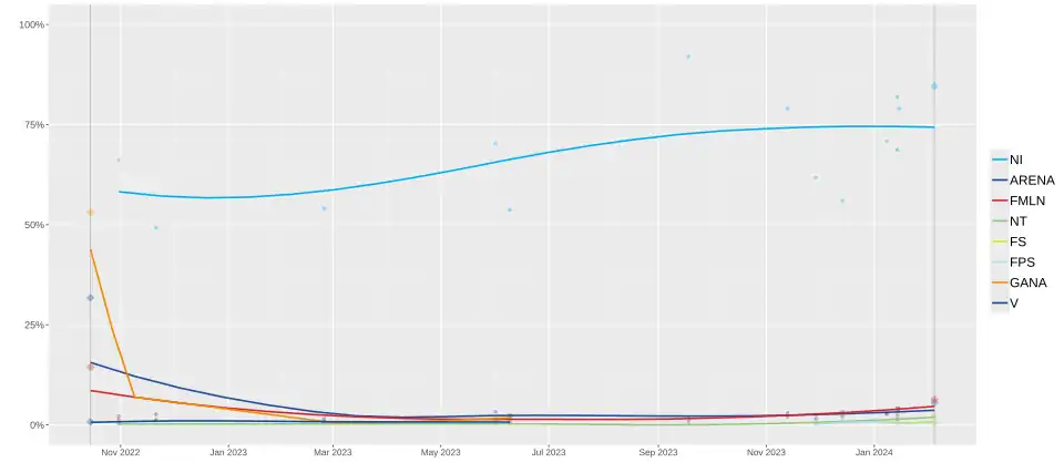 Únicamente el presidente, Nayib Bukele, manifestó sus intenciones de ser nuevamente candidato presidencial bajo la bandera de Nuevas Ideas en 2024.[64][65] El actual mandatario ha recibido el respaldo, según encuestas de opinión, de un amplio número de salvadoreños en el país y en Estados Unidos.[66]