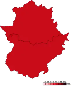 | PSOE-Progresistas (PSOE-p) | 194 264 | 49,65 | 19 | 119 153 | 46,68 | 15 | 313 417 | 48,68 | 34 | |