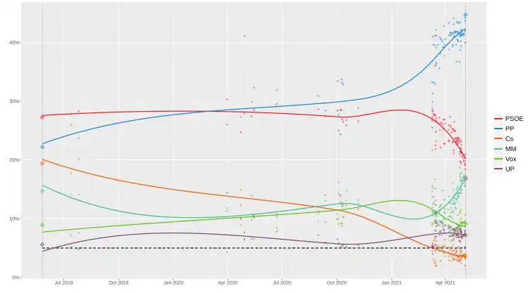- ↑ «Estimación Marzo 2021. Comunidad de Madrid. Autonómicas 4 de Mayo de 2021. TRACKING FLASH». SyM Consulting. 11 de marzo de 2021.