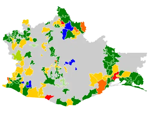 • 151 ayuntamientos. Regidos por el sistema de partidos, de un total de 570 (los restantes se rigen por usos y costumbres) compuestos por un Presidente Municipal y regidores, electos para un periodo de tres años no reelegibles para el periodo inmediato.