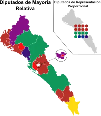 Para la elección de diputados de mayoría relativa del Congreso del Estado de Sinaloa , la entidad se divide en 24 distritos electorales.[ 5]