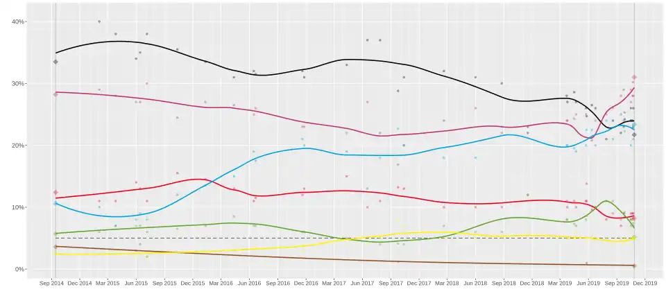 | Civey[20] | 2–26 Sep 2019 | 3,035 | 24.2 | 25.3 | 8.4 | 22.3 | 9.2 | 5.0 | 5.8 | 1.1 |