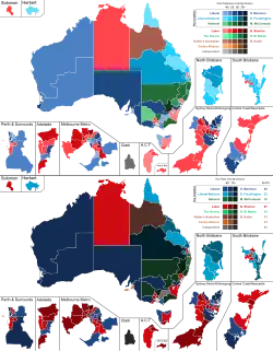 El mapa superior muestra la preferencia de la primera ronda por electorado. El mapa inferior muestra el resultado final de la votación de la segunda vuelta instantánea.