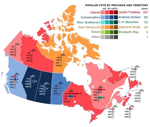El Partido Liberal, liderado por el primer ministro Justin Trudeau, ganó 157 escaños, suficientes para formar un gobierno en minoría, y perdió la mayoría obtenida en las elecciones de 2015. Los liberales perdieron en el voto popular ante los conservadores,[2] lo que marca la segunda vez que en la historia de Canadá un partido gobernante forma un gobierno con menos del 35 % del voto popular nacional. Los liberales recibieron el porcentaje más bajo del voto popular para un partido gobernante en la historia del país.[3]