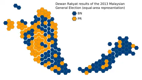 Representación de los resultados de las elecciones a las Asambleas Legislativas Estatales con cada hexágono representando un escaño. El Barisan Nasional participó como un solo frente electoral, mientras que el Pakatan Rakyat participó por separado con uno de sus tres partidos presentando candidatos en cada escaño. Al igual que ocurrió con la elección a nivel nacional, el BN fue derrotado por voto popular, pero mantuvo muchos más gobiernos estatales que el PR.