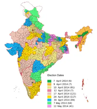 Las elecciones generales en India de 2014 renovó los 543 escaños del 16.º Lok Sabha. Se realizó en nueve fases: el 7 de abril, 9 de abril, 10 de abril, 12 de abril, 17 de abril, el 24 de abril, el 30 de abril, el 7 de mayo y el 12 de mayo de 2014, siendo la elección más larga en la historia del país. Los resultados de la elección fueron anunciados el 16 de mayo de 2014.
