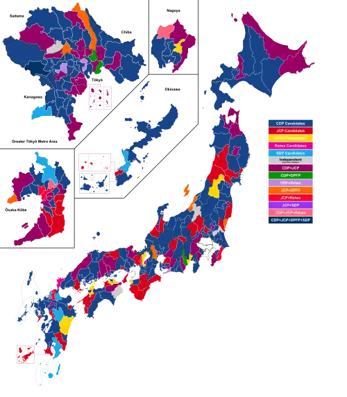 - Los dos partidos de oposición con mayor representación en la cámara, el Partido Democrático Constitucional y el Partido Comunista Japonés, perdieron escaños en general a pesar de haber realizado un acuerdo unificado de candidatos y una plataforma política conjunta en el período previo a las elecciones.[cita requerida]