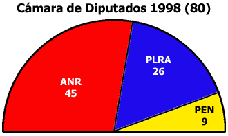 | Elecciones generales de 1998 Presidente y Vicepresidente de la República 45 escaños del Senado de Paraguay 23 escaños necesarios para la mayoría absoluta 80 escaños de la Cámara de Diputados 41 escaños necesarios para la mayoría absoluta | |||||||||||