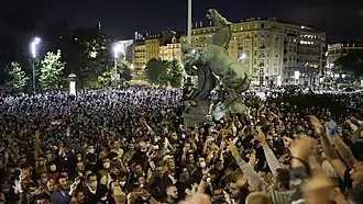 Numerosos asuntos gubernamentales desencadenaron el comienzo de las protestas antigubernamentales pacíficas de larga duración que comenzaron a fines de noviembre de 2018, denominadas "Una de los cinco millones".[11][12][13][14] Estas protestas ayudaron a fortalecer la unidad de las fuerzas de oposición, de las cuales la Alianza por Serbia (SzS) fue la más grande y destacada,[15][16] los manifestantes pedían la renuncia de Vučić y otros altos funcionarios.[17][18] Paralelamente a esto, Vučić lanzó la campaña "Futuro de Serbia" en 2019.[19] Algunos partidos y coaliciones de la oposición declararon que boicotearían las elecciones parlamentarias de 2020, alegando que las condiciones no eran libres ni justas.[20][21] Debido a estas decisiones, SzS se vio afectado por problemas entre partidos y coaliciones que se mantuvieron hasta su disolución en agosto de 2020.[22] Las protestas terminaron a principios de 2020 debido al inicio de la pandemia de COVID-19 en el país.[23]