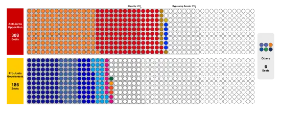 Los dos principales partidos conectados a la antigua junta militar, el Partido Palang Pracharath y su escindido Partido de la Nación Unida Tailandesa[37] perdieron la mitad de sus escaños en comparación con el resultado de Palang Pracharath en 2019. El Partido Demócrata, un socio menor de la coalición, también perdió más de la mitad de sus escaños. El Partido del Orgullo Tailandés fue el único partido de coalición que ganó escaños en estas elecciones.