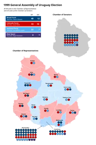| Elecciones generales de 1999 Presidente y Vicepresidente de la República 30 miembros de la Cámara de Senadores 16 escaños necesarios para la mayoría absoluta 99 miembros de la Cámara de Representantes 50 escaños necesarios para la mayoría absoluta | |||||||||||