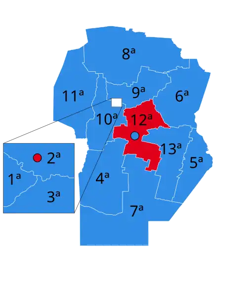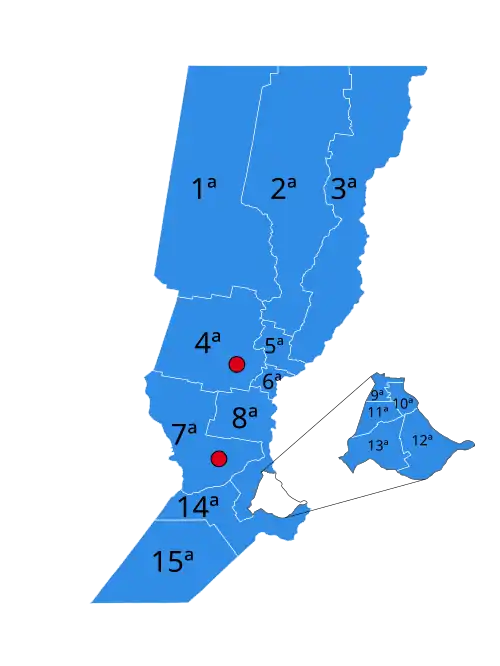 | Distrito | Diputados | Circunscripciones | Bonificación a la minoría | Senadores | ||||||