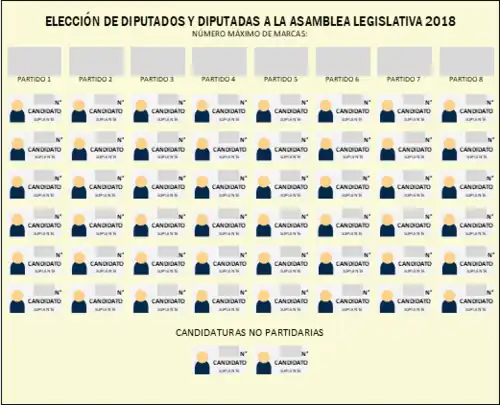 - Votar por la bandera de un partido político y seleccionar candidatos dentro de dicha lista para ocupar las diputaciones (únicamente suman marcas los candidatos seleccionados);