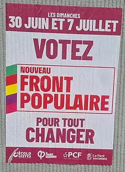 El político de izquierdas François Ruffin hizo un llamamiento a todos los partidos de izquierda, incluidos Los Ecologistas (LE), a formar un "frente popular" para evitar el "peor" resultado.[21] Los llamamientos a la unidad también fueron compartidos por el líder del Partido Socialista (PS) Olivier Faure, la líder del LE Marine Tondelier y el líder del Partido Comunista Francés (PCF) Fabien Roussel.[22] Una carta de 350 intelectuales (entre ellos Esther Duflo y Annie Ernaux) pidiendo una unión de las fuerzas de izquierda fue publicada en Le Monde el 10 de junio.[23] El Nuevo Frente Popular se estableció el mismo día, reuniendo a La France Insoumise (LFI), el PS, LE, el PCF, Place Publique y varias otras fuerzas políticas.[24]