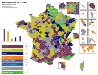 Las elecciones legislativas de Francia de 2024 se realizaron en dos vueltas. La primera vuelta tuvo lugar el domingo 30 de junio, y la segunda se realizó una semana después, el domingo 7 de julio. En dichos comicios se votó para elegir a los 577 miembros de la decimoséptima Asamblea Nacional de la Quinta República Francesa. El proceso electoral fue convocado de manera anticipada por el presidente Emmanuel Macron a raíz de los malos resultados que este obtuvo en las pasadas elecciones al Parlamento Europeo. Estas elecciones legislativas finalmente dieron como resultado la victoria de la coalición de izquierda Nuevo Frente Popular en la segunda vuelta; un resultado cosechado, en parte, a las alianzas que dicha coalición realizó con Ensemble, la agrupación de Macron; ambas coaliciones acordaron retirar de la segunda vuelta a candidatos suyos en numerosos distritos electorales donde la división de votos entre ambas coaliciones hubiera dado como ganador a los candidatos de Marine Le Pen. Agrupación Nacional, de Le Pen, no retiró a ningún candidato suyo en ningún distrito en la segunda vuelta; esto explica que haya quedado tercero en el número de escaños a pesar de que a nivel individual fue la formación política con más votos con el 37%. Para evitar la realización de una segunda vuelta en un distrito electoral, un candidato debe ganar en la primera vuelta con más del 50% de los votos en dicho distrito. Para clasificar a una segunda vuelta, un candidato debe tener mínimo 12,5% de los votos en la primera vuelta; en la mayoría de los distritos, suelen clasificar 3 o 4 candidatos, en esos casos no se exige tener más del 50% de los votos para ganar el distrito electoral. En estas elecciones, solo en 76 de los 577 distritos electorales hubo un candidato que obtuvo más del 50% de los votos en la primera vuelta realizada el 30 de junio, es decir que en 501 distritos se debió realizar una segunda vuelta el 7 de julio.