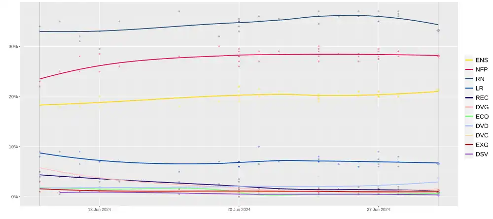 Los sondeos de opinión previos a las elecciones sugerían que la alta participación y el nivel de tripolarización del electorado entre Renacimiento, el Nuevo Frente Popular y la Agrupación Nacional podrían conducir a un número sin precedentes de segunda vuelta a tres bandas en la segunda vuelta de las elecciones. Los analistas también señalaron que la consolidación del electorado detrás de estas tres principales fuerzas políticas también podría resultar en un bloqueo institucional total después de las elecciones en caso de que ningún bloque tenga los votos para asegurar el apoyo de una mayoría absoluta de la Asamblea Nacional lo que podría obligar a Macron a convocar unas segundas elecciones anticipadas tan pronto como un año después de las elecciones de 2024.