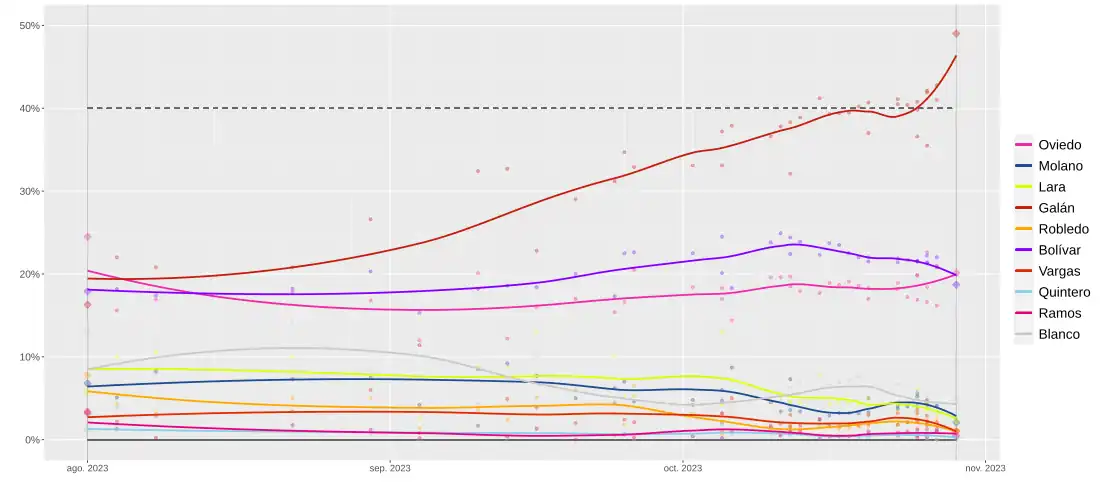 - ↑ a b «Galán está cerca de ganar en primera vuelta y Oviedo se acerca a Bolívar». AsuntosLegales. 11 de octubre de 2023. Consultado el 11 de octubre de 2023.