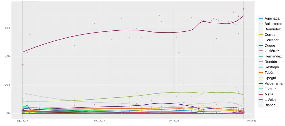 - ↑ «Federico Gutiérrez le toma más ventaja a Upegui por la alcaldía de Medellín». El Espectador. 25 de octubre de 2023. Consultado el 25 de octubre de 2023.