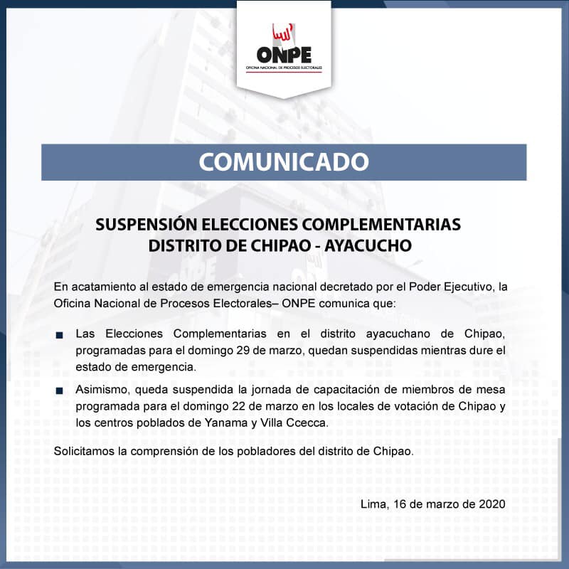 - ↑ «Suspensión Elecciones Municipales Complementarias Distrito de Chipao - Ayacucho». onpe.gob.pe. 16 de marzo de 2020.
