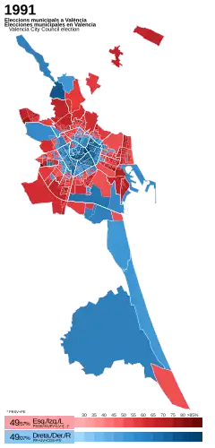 Las elecciones municipales de 1991 se celebraron en Valencia el domingo 26 de mayo, de acuerdo con el Real Decreto de convocatoria de elecciones locales en España el 1 de abril de 1991 y publicado en el Boletín Oficial del Estado el día 2 de abril.[1] Se eligieron los 33 concejales del pleno del Ayuntamiento de Valencia mediante un sistema proporcional (método d'Hondt) con listas cerradas y un umbral electoral del 5 %.