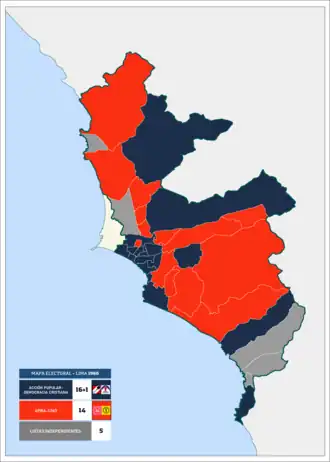 La siguiente tabla enumera el control de los distritos de la provincia de Lima. El cambio de mando de una organización política se resalta del color de ese partido.
