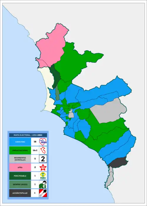 - ↑ a b c d e f g h i j k l m n «Elecciones municipales en la provincia de Lima - Noviembre 2002». kas.de. 2002.
