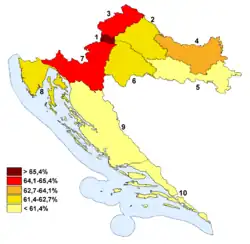 Desde 1999, Croacia se ha dividido en 10 distritos electorales del Parlamento, nombrados con números romanos. Estos distritos se basan más o menos en la geografía, pero se les da forma según la cantidad de votantes, de modo que cada distrito tiene aproximadamente el mismo número de votantes registrados, alrededor de unos 400,000.[20] Por lo tanto, estos distritos no corresponden a las fronteras de las principales divisiones administrativas dentro de Croacia y cada distrito contiene uno o más o partes de varios condados croatas.