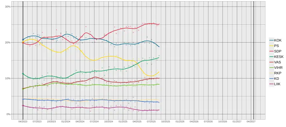 | Elecciones parlamentarias de 2027 200 escaños del Eduskunta 101 escaños para obtener mayoría absoluta | |||||||||||