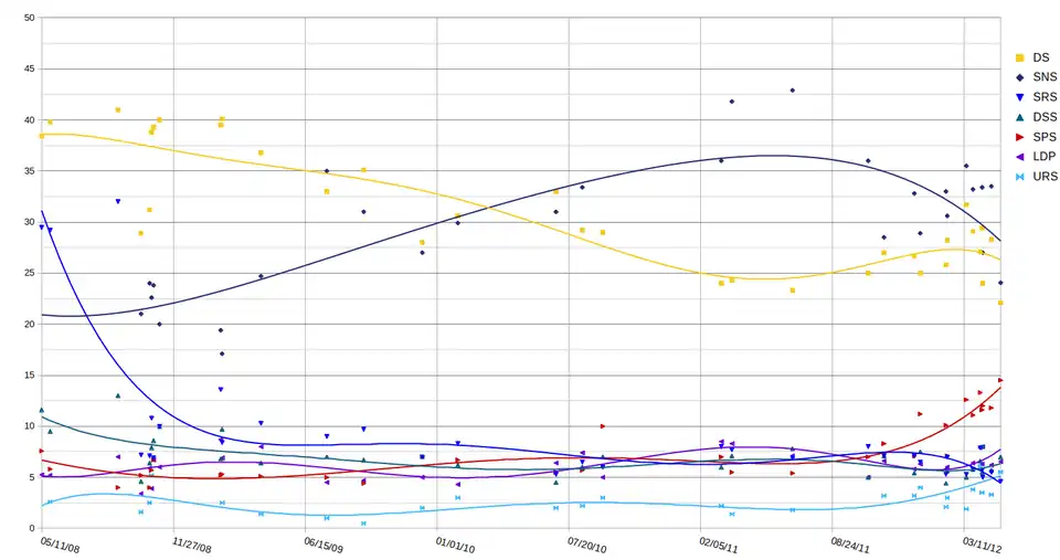 En la oposición, el Partido Radical Serbio (SRS), tuvo una división después de las elecciones. El Partido Progresista Serbio (SNS) se separó y encabezado por Tomislav Nikolić y Aleksandar Vučić, quienes fueron figuras importantes en el SRS antes del establecimiento del SNS a finales de 2008. En la mayoría de las encuestas de opinión, ellos y el Partido Demócrata (DS) siguen siendo los dos partidos más populares, y en combinación obtienen al menos el 60 por ciento del voto total cuando se combinan. Otros partidos se quedan muy atrás, luchando incluso por alcanzar cifras de popularidad de dos dígitos.[3]