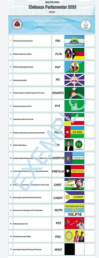 - ↑ da Piedade, Domingos (16 de marzo de 2023). «Boletins de voto das legislativas poderão ter 18 opções». TATOLI Agência Noticiosa de Timor-Leste (en inglés estadounidense). Consultado el 22 de mayo de 2023.
