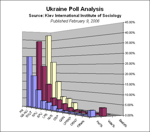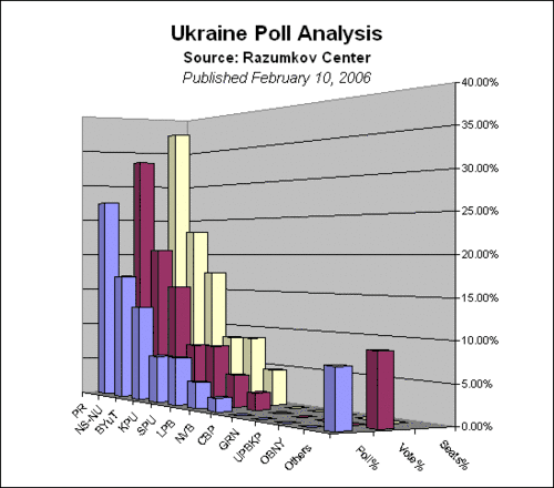 - ↑ Razumkov Centre: 8 лютого 2006 Наміри голосування на виборах до Верховної Ради України та ідеологічні орієнтації громадян (Центр ім.О. Разумков) (enlace roto disponible en Internet Archive; véase el historial, la primera versión y la última). (Realizada entre el 26 y 31 de enero de 2006, publicada el 8 de febrero, solo en ucraniano)