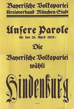 Después de la primera vuelta de las elecciones, Jarres se retiró en favor de Hindenburg, quien era un monárquico comprometido y popular exgeneral. Aunque Hindenburg no tenía ningún interés en buscar un cargo público y estaba especialmente inquieto ante la idea de convertirse en el jefe de Estado alemán, accedió a regañadientes, supuestamente sólo después de consultar primero con el emperador depuesto. Sus principales defensores fueron el Partido Popular Alemán (DVP), el Partido Nacional del Pueblo Alemán (DNVP) y el Partido Popular Bávaro (BVP). El DVP, y especialmente su líder Gustav Stresemann, tenían reservas sobre la idea de una presidencia de Hindenburg, debido a sus posibles repercusiones para la política exterior alemana, pero con el tiempo llegaron a apoyarlo. Ludendorff se retiró debido a sus malos resultados y muchos de sus simpatizantes (especialmente los nazis), también apoyaron a Hindenburg.[3]