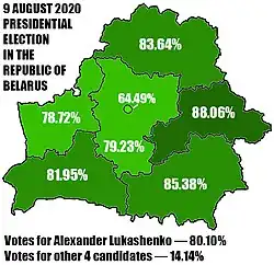 - ↑ «ЦИК огласил окончательные итоги выборов. За Лукашенко проголосовало 80,1%, за Тихановскую — 10,1%». TUT.BY (en ruso). 14 de agosto de 2020. Archivado desde el original el 14 de agosto de 2020. Consultado el 14 de agosto de 2020.