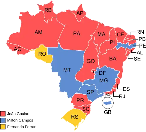 | Estado/Territorio | João Goulart | Milton Campos | Fernando Ferrari | Válidos | Blancos | Nulos | Emitidos |