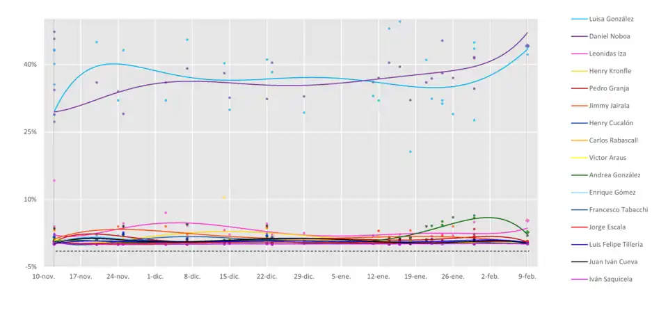 - ↑ a b Quito, Yalilé LoaizaDesde (7 de febrero de 2025). «Elecciones Ecuador: Daniel Noboa y Luisa González cerraron sus campañas con actos masivos en Quito y Guayaquil». infobae. Consultado el 10 de febrero de 2025.