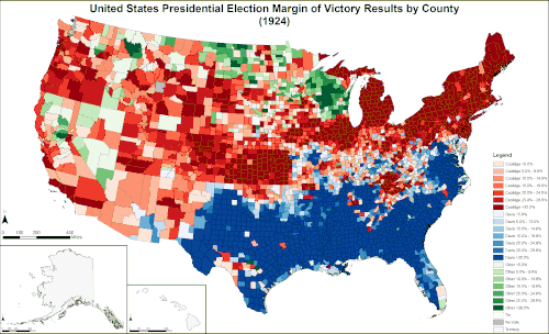 Los avances de la candidatura de La Follette en el Partido Demócrata se produjeron en áreas donde las mayorías demócratas de condado habían sido poco frecuentes en el Sistema del Cuarto Partido. Al mismo tiempo, los avances de la candidatura de La Follette en el Partido Republicano se produjeron en áreas donde en esta contienda nacional su candidato podía permitirse el lujo de quedar segundo o tercero en la encuesta.[8] Por lo tanto, Davis ganó sólo el sur y Oklahoma, tradicionalmente demócratas; Debido a que los demócratas liberales votaron por La Follette, Davis perdió el voto popular frente a Coolidge por 25,2 puntos porcentuales. Sólo Warren Harding, que terminó 26,2 puntos por delante de su competidor más cercano en las elecciones anteriores, obtuvo mejores resultados en esta categoría en la competencia entre múltiples candidatos (James Monroe fue el único candidato en 1820 y, por lo tanto, obtuvo todos los votos).