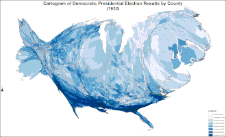 Cartograma del porcentaje del Partido Demócrata por condado. |